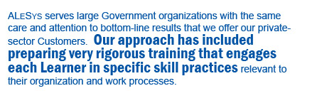 A large government Agency wanted to outsource the management and administration of training materials and training sessions that were part of their new approach to preparing staff to function successfully.  They asked ALESYS to perform this outsource service and manage all the details of this training, as part of our partnership to develop the new training process.